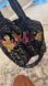 Width is 17 inches from middle the long strap is 14 inches no flwas on the embroidery just minor discoloration on the magnet button