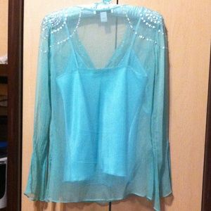 Gorgeous Tiffany Hued Laundry by Shelly Segal Silk Top. Middle Eastern Inspired Design. Silver Sequin Embellishment at Shoulders & Chest. 100% Sheer Silk. Poly Matching Cami. Gently Used. *Slight Tear on Side @ Seam which can be Easily Fixed/Stitched up!!! Matching padded hanger included!