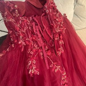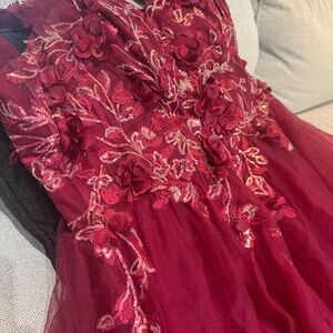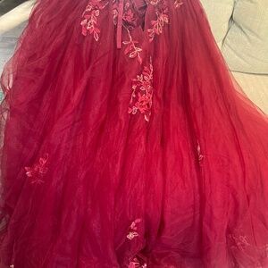 Maroon Red Evening gown with lace bodice in the back and shoulder straps to be worn on or off the shoulder. Gown has a small train - perfect for prom or a formal evening event.