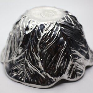 Very shiny and a show stopper. Deep bowl with lettuce/cabbage leaves up the sides. Looks like Beatriz Ball but the insignia on the bottom is a swirl inside a square box and the letter “C” inside a circle. Dimensions: height – 4” and width – 7 ½”. Weighs nearly a pound and a half.