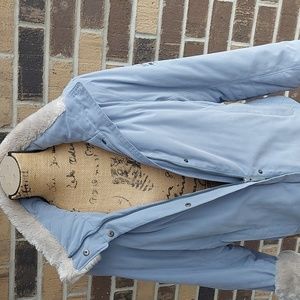 Gorgeous Metropolis Faux Fur Mock Neck Cuffed Warm Jacket with zip front.. fmFully lined and Warm for Fall or Winter. Blue with faux fur cuffed arms that can be worn down with no fur showing or cuffed up. zips at sleeves. pockets at each side and pocket inside. Excellent condition. no flaws.
