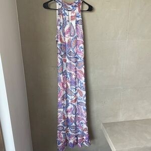 This sleeveless maxi dress features a flowing silhouette with a halter neckline that ties at the back, creating an elegant yet relaxed look. The fabric showcases a lively paisley print in shades of coral, periwinkle, lavender, and soft blue on a white background — giving it a breezy, summery feel. The lightweight material drapes beautifully, making it perfect for warm-weather occasions, resort wear, or casual evenings out. Its long length and vibrant pattern lend an effortlessly chic and feminine vibe that can easily transition from day to night.