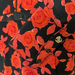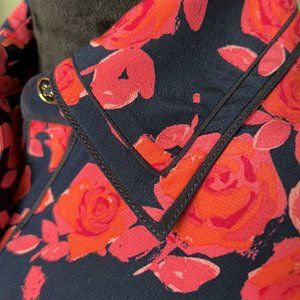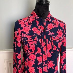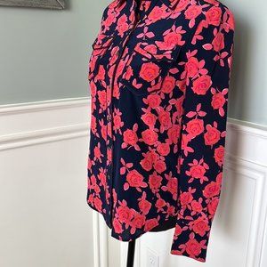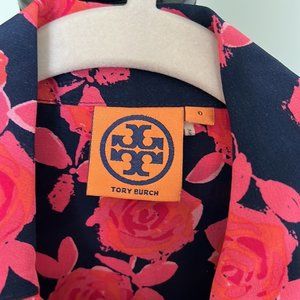 Tory Burch elegance! Hard to find Tory Burch ready to wear silk blouse. Navy blue, 100% Silk blouse with modern floral print in coral and pink is perfect for work or with jeans. Button down front with sophisticated double collar and double pocket flap look (they’re sewn down), princess seams, three buttons on each cuff, buttons are navy enamel with gold edge. NWOT, never worn, never laundered, paper still on one of the buttons (see photo). Size 0 is a generously sized small, about 16” across front at chest, about 28” long from top of back collar to bottom. non-smoking, pet-free home.
