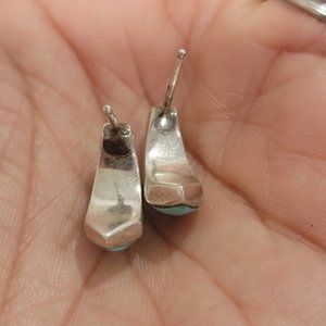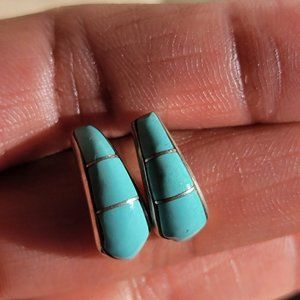 Stunning handmade Native American 925 sterling silver earrings. Long graduating in thickness tapered curved bars with handcarved baby turquoise inlay. Three pieces inlay between 925 sterling silver lines. More of a raised inlay. Fine craftsmanship. Stick posts. No stamps, but tested and guaranteed. One has a natural gray speck on the tapered turquoise panel. Appears to have a small chip on that side near the triangle tip, really not that noticable. Love the delicate look and exceptional quality of these earrings. No backings as shown.