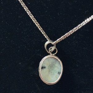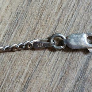 This fabulous piece is in very good to excellent pre-owned condition; I have, in fact, been the only owner. The turquoise itself is a beautiful robin's egg blue, with hints of green and some really neat visible matrix! I did try to figure out what it was, but I am not an expert in turquoise identification, alas. It has a lovely floral stamped pattern around stone in sterling silver and a 0.925 stamped sterling chain. There is a small maker's mark in the shape of a diamond on the clasp as well.