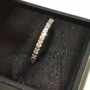 There is a ton of sparkle in this little band. A total of 1 carat of small round cut pave set AAA top quality simulated diamond gemstones are set all around the diameter of the band for an eternity style ring. The setting and band have been heavily layered in 140 mils of 18 K White Gold plate and then layered in rhodium for the look and durability of platinum. It is size 6.