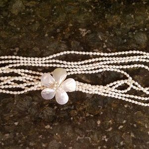 This necklace has 5 strands of oval pearl like beads with a beautiful pearl shell flower. The clasp has 2 small rhinestones on it.  It is in perfect condition and simply beautiful.  It is 28" long.  Feel free to make offers on any of the items I have listed.