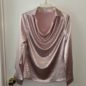 Light Pink Satin Blouse with Draped Neckline. This shiny Pink blouse features a delicately draped neckline and gorgeous material making it both sophisticated and perfect for casual, professional and evening wear.