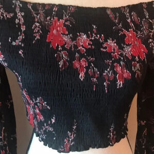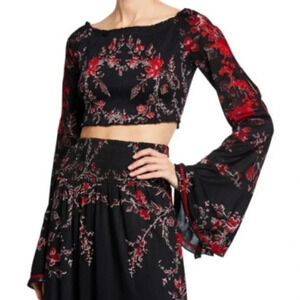 Smocked blouse in floral and paisley print. Long bell sleeves with cutouts, cropped midriff, fitted silhouette. Just gorgeous!