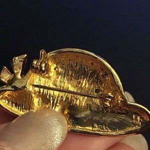 Add a touch of elegance to your outfit with this stunning red and gold hat brooch. Perfect for any occasion.