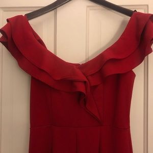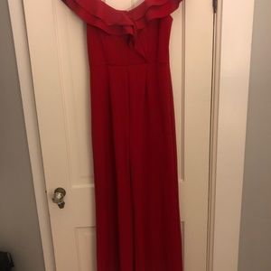 Make a statement during the holidays in this classy but sassy one piece jumper / romper / pant suit. I wore it to a fancy wedding -- absolutely love this jumper but it doesn't fit the same post-baby. Ruffle with v neck at the top, flairs at the bottom pant legs. This was so much fun to wear!