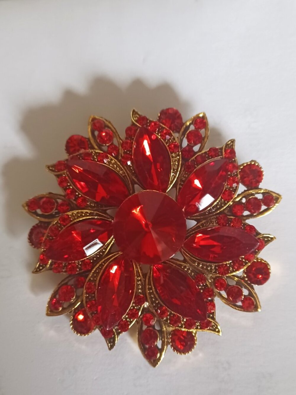 Add a touch of vintage glamour to your outfit with this ruby red rhinestone brooch.
