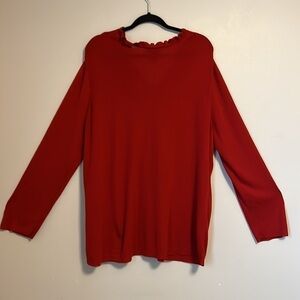 Pre owned perfect condition vintage made in Hong Kong Red Sweater soft and stretchy ruffled neckline slit sleeves