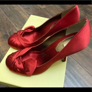 Stored in original box! Genuine satin and Leather heels. Classic and timeless with sexy graceful lines, this heel adds that pop of color you need in your closet! Perfect to dress up your favorite jeans or with your favorite dress they go with anything and are very comfy to wear! Slight wear with 1 small snag that isn’t noticeable unless you go looking for it shown in pictures. I only wore it 1 time for a wedding. I have these in rose red, royal blue and black if you buy all 3 I’ll cut you an amazing deal so please check them out!