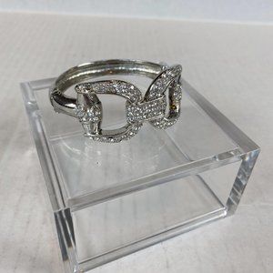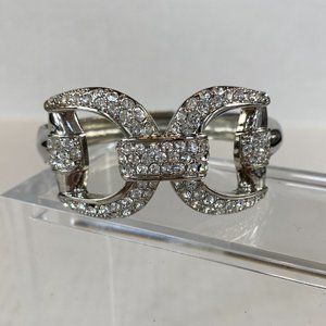 Timeless, elegant, and expensive looking rhinestone crystal encrusted bracelet with hinged magnetic closure. In excellent like new condition. Design is reminiscent of horse bit and stirrup styles of luxury designers. Diameter: 2.5" Length of stirrups part: 2"