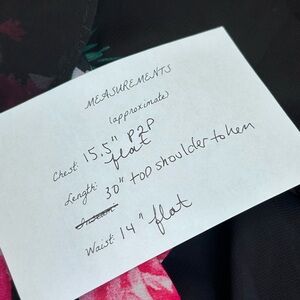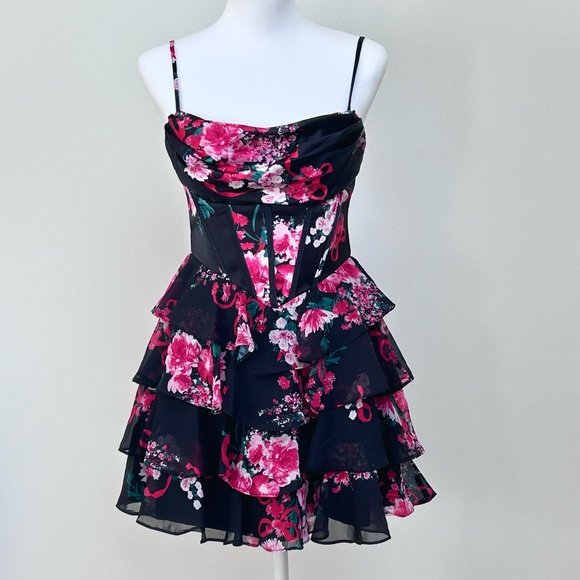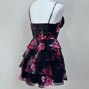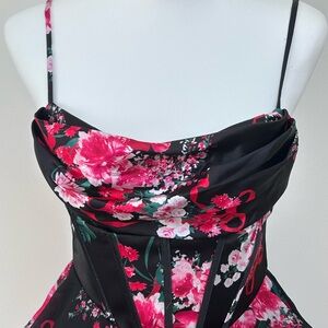 Beautiful Pink and red roses and bow-tied ribbons adorn this black satin and chiffon mini dress with corset, boning in front and back, padded cups, cowl neckline, adjustable spaghetti straps, and layers of ruffles on skirt. Size 5/6. Zip closure. Some small runs in satin part of fabric, hard to see but pictured. See pics for measurements. Absolutely beautiful and perfect for Valentineās Day! Buy now and Iāll ship asap so it gets to you by then. Thanks for looking!