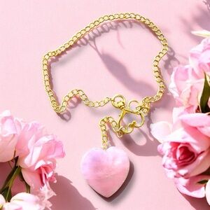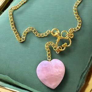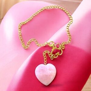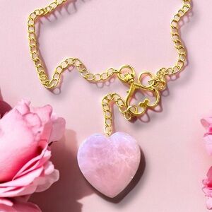 Pretty in Pink Gorgeous Rose Quartz heart pendant necklace It is the love stone for a reason This exquisite necklace features a delicate gold toned chain adorned with a soft pink rose quartz heart pendant. Rose quartz, often referred to as the "Heart Stone," symbolizes unconditional love and infinite peace, fostering deep inner healing and self-love. Its healing properties have the power to enhance positive affirmations, restore trust and harmony in relationships, and aid in emotional healing. Wearing your rose quartz it also acts as a protective shield against environmental pollutants and replaces negative energies with loving vibes. 16” chain with a 4” drop. Stainless steel and aluminium. Heart lobster clasp. This is a one of a kind unique necklace.