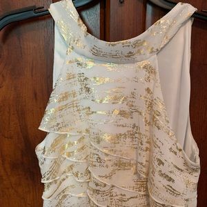 Gorgeous cream and shimmering gold top. Ruffles down the front. Zipper on the one side. The back has a tie at the neck. Lined in the front. And back. Very pretty on! Size Large.