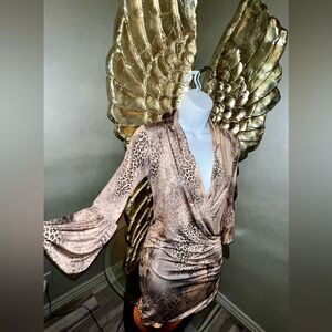 Gorgeous Savee Couture Animal Leopard Wrap V drape neckline, Bell Sleeves, XS