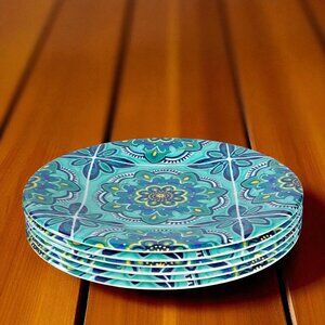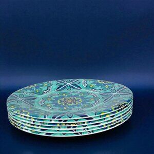 Gorgeous Set Of 6 Teal Blue Floral Tile Spanish Mandala Melamine Dinner Plates Large 11" Spring Hammered Texture Bobby Flay BPA Free