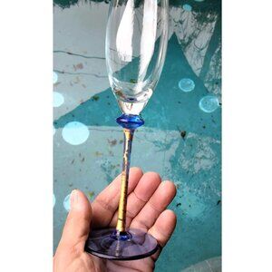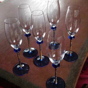 Gorgeous Set of 6 Art Glass Cobalt Blue Gold Painted Stemmed Champagne Flutes