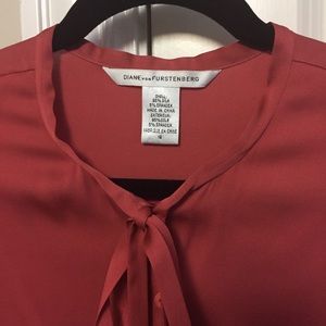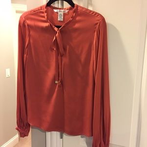Beautiful silk with no flaws. Never worn. Salmon color with button front. Ties has pretty gold trim on them. Wear open or tied into bow. Sleeves have pretty billow at wrist. Runs a little small - more like a 10.