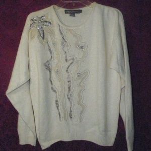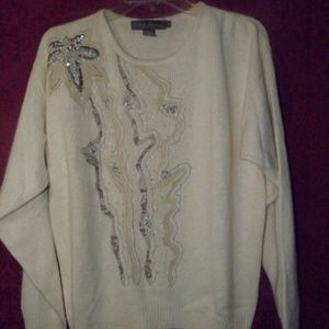 Gorgeous Silk and Angora Blend long Sleeve Sweater, Sequin, Beads and placed embroidered Leather look appliques make this Sweater a must have in your Fall Wardrobe.