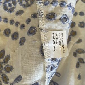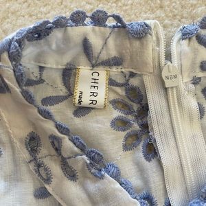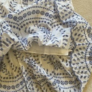 The fabric is a gorgeous white cotton with blue eyelets and fern leaves embroidery. Has cotton lining for modesty. Zips in center back. Tassels in front neck to tie or leave open.