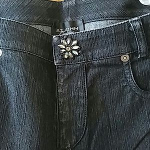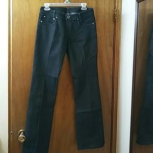 Black denim jeans with embellished back pockets and button. Straight leg. No size tag, but they fit a 10. EUC.
