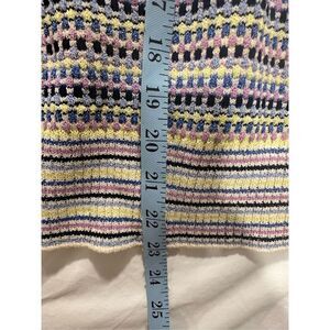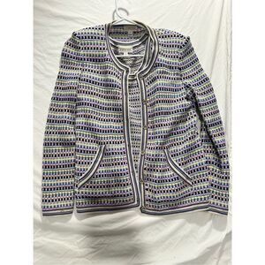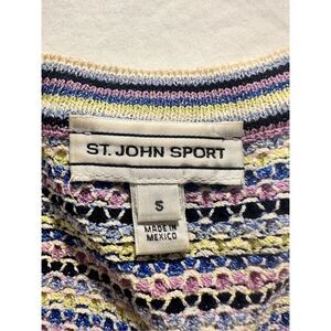 Gorgeous St. John multicolored cardigan and tank top set, size small and the tank top is size P. The cardigan has buttons and is a wool blend. The cardigan has a small stain on the sleeve (see pictures). The set is a wool blend, but lightweight. Perfect for any occasion.
