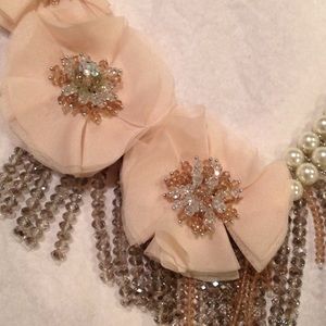 Gorgeous statement necklace with cream gauzy flowers with clear and beige crystal centers, beige and gray crystal beads hanging from a faux-pearl strand. 21 1/2" long with an additional 3" extender. Seriously pretty and one-of-a-kind!