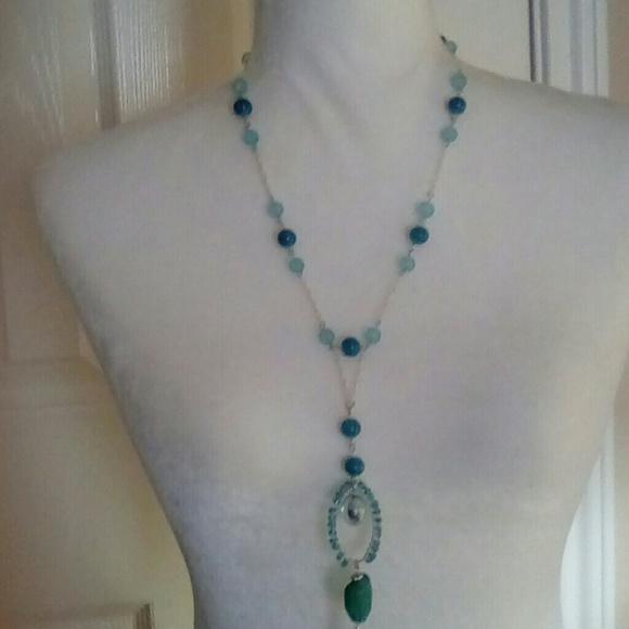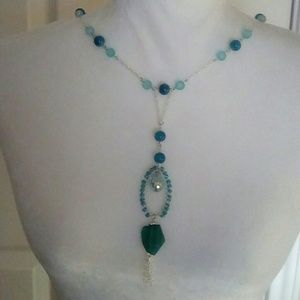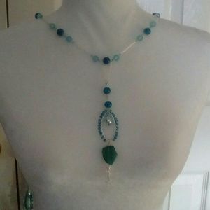 Shades of Aqua and Turquoise Glass Beads with Silver Chain. Handcrafted by Four Seasons Designs.