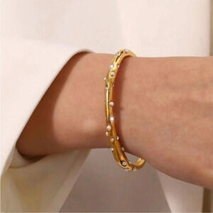 Gorgeous Studded Pearls Diamonds CZ Open Cuff Bracelet in Gold