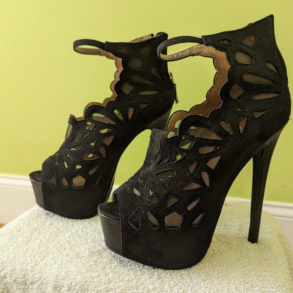 Beautiful Sky High Black Heels from BEBE. Material is suede and net with intricate laser cut design. Sz 6. 5+ inch heels with ~ 2 inch platform. Rarely worn- great condition. No box (sorry) but has been well-stored. Smoke Free Home.