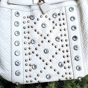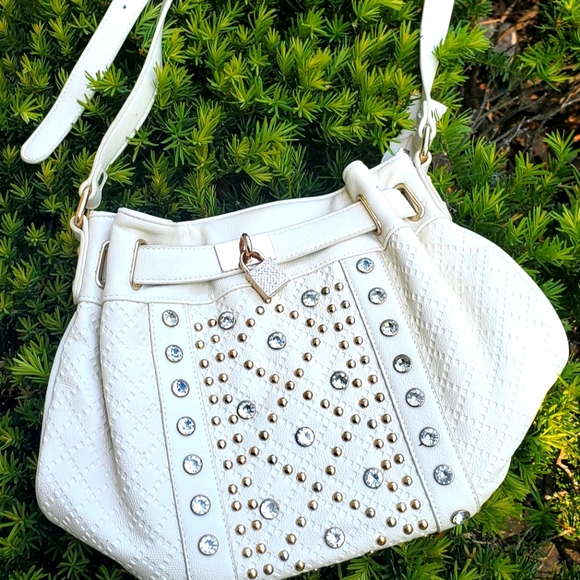 ❤💋Introductory price❤💋 cream colored ❤💋 Symeli Rhinestone❤💋 purse.❤💋 All of the rhinestones❤💋 and studs❤💋 are in place❤💋 and there a❤💋 little lock on the front❤💋 for decorative❤💋 purposes only.❤💋 There is a ❤💋zipper closure❤💋 with extra❤💋 pockets inside❤💋 and a strap for❤💋 carrying on❤💋 your shoulder.❤💋 There is also❤💋 a zipper pocket❤💋 on the back❤💋 of the purse❤💋 as well as a flat bottom❤💋 for sitting upright. ❤💋See pictures enclosed. ❤💋Comes from a❤💋 smoke free home.❤💋