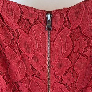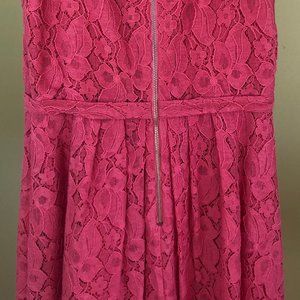 I've never received so many compliments than from when I wore this dress. The pictures don't even do it justice. It's a beautiful pink color with full lace overlay. Gathered at the waist and a pleated skirt. Midi dress/formal. Beautifully tailored. This item is in excellent condition. I can't say enough about this dress. I wish it still fit! Smoke/pet-free home. 20% discount with the purchase of 3 items. Make an offer!