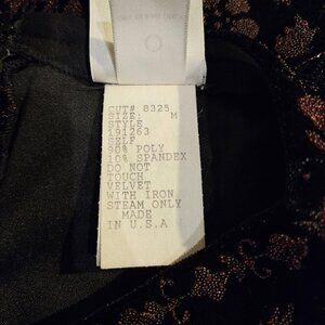 Vintage though in excellent condition with no known flaws. Lined polyester & spandex with velvet & beading throughout top. it is beautiful, comfortable, and classy. The back is full length zipper.