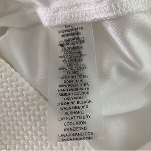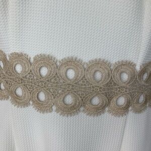 Vince Camuto cream and gold sheath halter dress size 6. Gorgeous lace design at waist with gold threads in lace. 3-D raised design in fabric. 100% polyester lining. 96% polyester 4% spandex main. Hand wash Cold. Zips down the back. Halter neckline. Armpit to armpit measures 16 inches. Waist measures 14 inches across unstretched. Shoulder to hem line 37 inches. Excellent preowned condition