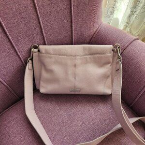 This is a gorgeous pastel lavender pebbled leather cross body bag. It was only used for one short vacation. The measurements are 10"W x 7"Tall. The hardware is silver with 2 silver rings on the magnetized flap. The back of the handbag has a slip pocket running the length of the bag. Inside the purse are 2 slip pockets and a zippered pocket. There is a thick (1") comfortable cross body strap in matching leather.