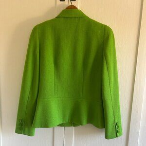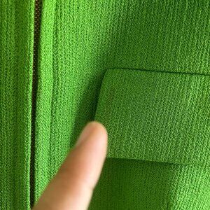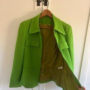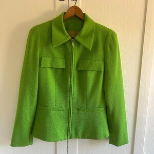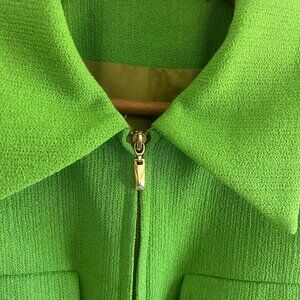 Stunning zip-up vintage 90s jacket in a head-turning shade of lime green. Features gold zipper and zipper pull, slight shoulder pads, and two flap pockets at chest. In great condition outside of small, hard to see stain on left flap pocket. Fits like a womens XS. No label except for a "Dry Clean Only" tag.