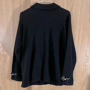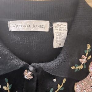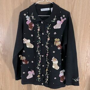 This vintage 90’s Christmas sweater is in excellent condition. It is beautifully designed with stockings and flowers in embroidery, crochet, ribbons, rhinestones, pearls, sequins and is thick and warm black knit.