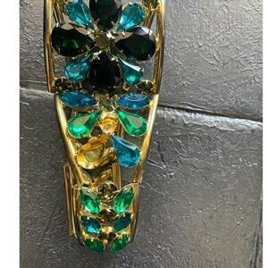 80s Romance Emerald Green and large Black faceted and pronged, glistening rhinestones statement bracelet