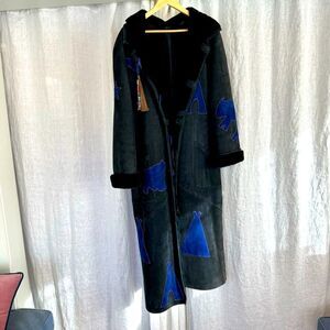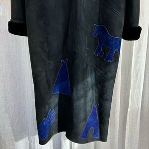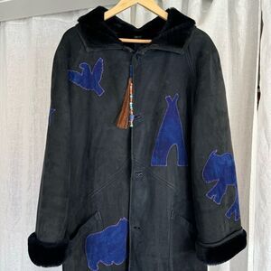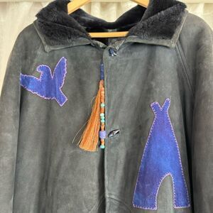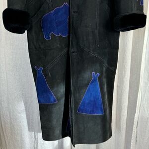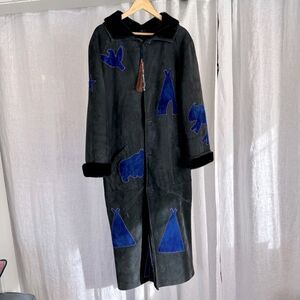 Tags: Suede & Shearling Maxi Coat Applique Patchwork Rare Unique One of a Kind Vintage Montana Handmade Native American Western Embroidered Apres Ski Winter Resort art to wear storyteller coat extra warm unisex long coat artisan Aspen luxury