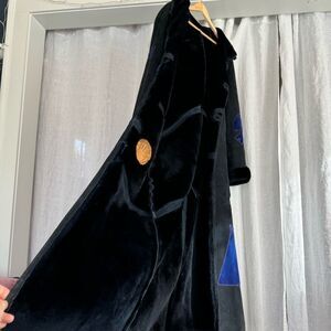 One of a kind, rare, exquisite artisan handmade black suede maxi coat with soft black shearling lining, classic lapel collar, front patch pockets & incredibly beautiful details: