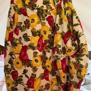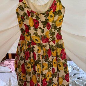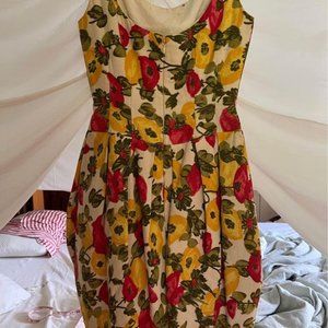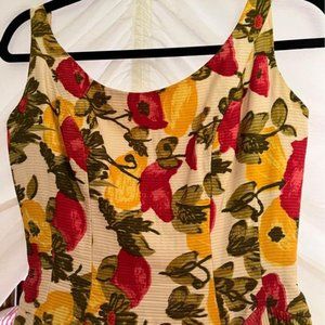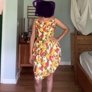 Stunning 60s vintage bright floral dress with bubble hem and gathering in front and pleats in back! Very structured and flattering silhouette with thick cotton material— no stretch. Bubble skirt has some tulle lining to give the dress more volume and structure. Make this dress pop with bright red lipstick and 👠!!