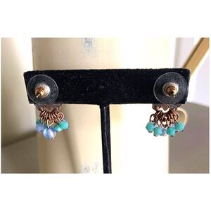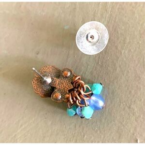 Jadeite Carved Rose on a metal leaf base with faceted Blue Crystals and beads dangling by metal links