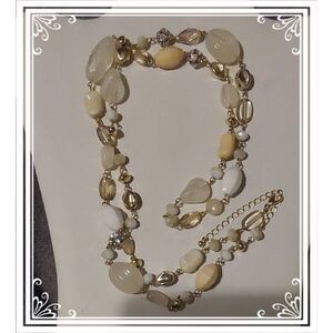 Has goldtone, faceted milky and topaz beads as well as round crystal pave studded ball beads.