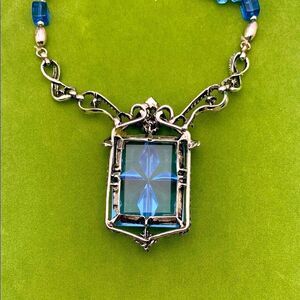 The 4-squared, faceted Blue Crystal forms the centerpiece of this gorgeous necklace and adds to the beauty of this well-faceted Clear and Blue crystal beaded necklace