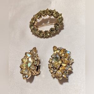 Gorgeous Vintage Yellow and AB Rhinestone Clip Earrings & Brooch Lot Gold Tone