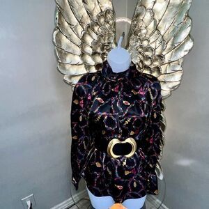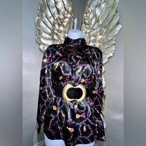 This is one gorgeous blouse, buttons up, polyester, very silky and comfortable! Draws a lot of compliments. Please see pics for measurements and details, no flaws, gently worn Versace vibes